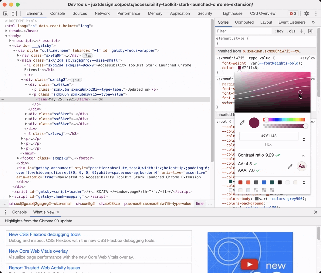 Click on the square block with color, there will be a tooltip that allows you to pick new colors. We can also see a line is called "Contrast Ratio", clicking on the row will further expand in displaying all accessibility information.